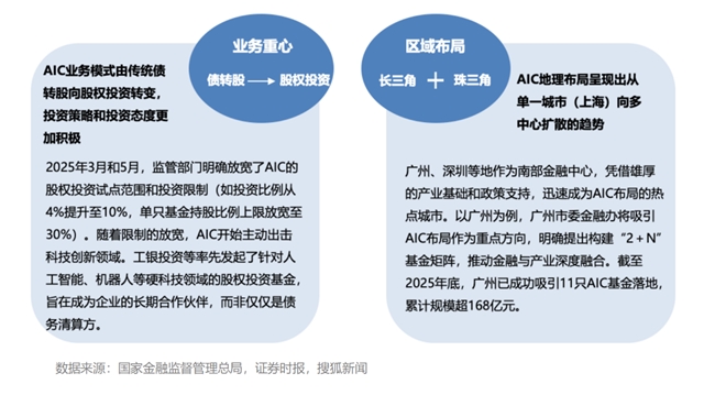 作为中国股权投资市场一支重要的新兴力量,2025年银行业金融资产投资公司(AIC)进入了扩容破壁的关键阶段,呈现出从国有垄断向股份制共生、从债转股向股权投资转型的显著特征,头部股份制银行首次入局打破国有大行长期垄断格局,为市场带来更灵活的投研思维和退出机制。地理布局上,呈现出从单一城市(上海)向多中心扩散的趋势,2025年底,广州已成功吸引11只AIC基金落地,累计规模超168亿元。