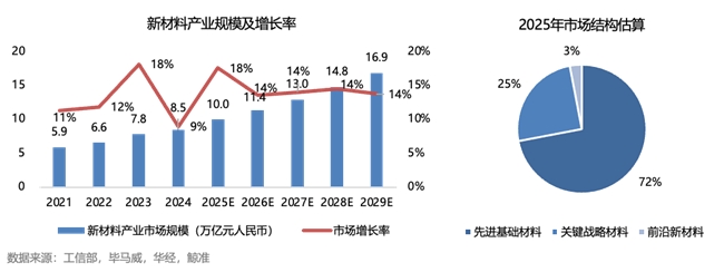 新材料作为我国国民经济的重要支柱产业,是制造业高端化升级的核心上游资源,根据发展定位分为先进基础材料、关键战略材料、前沿新材料三大类,分别承担着支撑产业转型、突破“卡脖子”难题、驱动未来产业发展的重要使命。2025年我国新材料产业总规模预计突破10万亿元大关,其中先进基础材料占据72%的核心市场,关键战略材料成为产业竞争焦点,前沿新材料虽市场占比小但增长潜力巨大,其产业链涵盖上游资源保障、中游材料制造、下游多场景应用的完整体系。