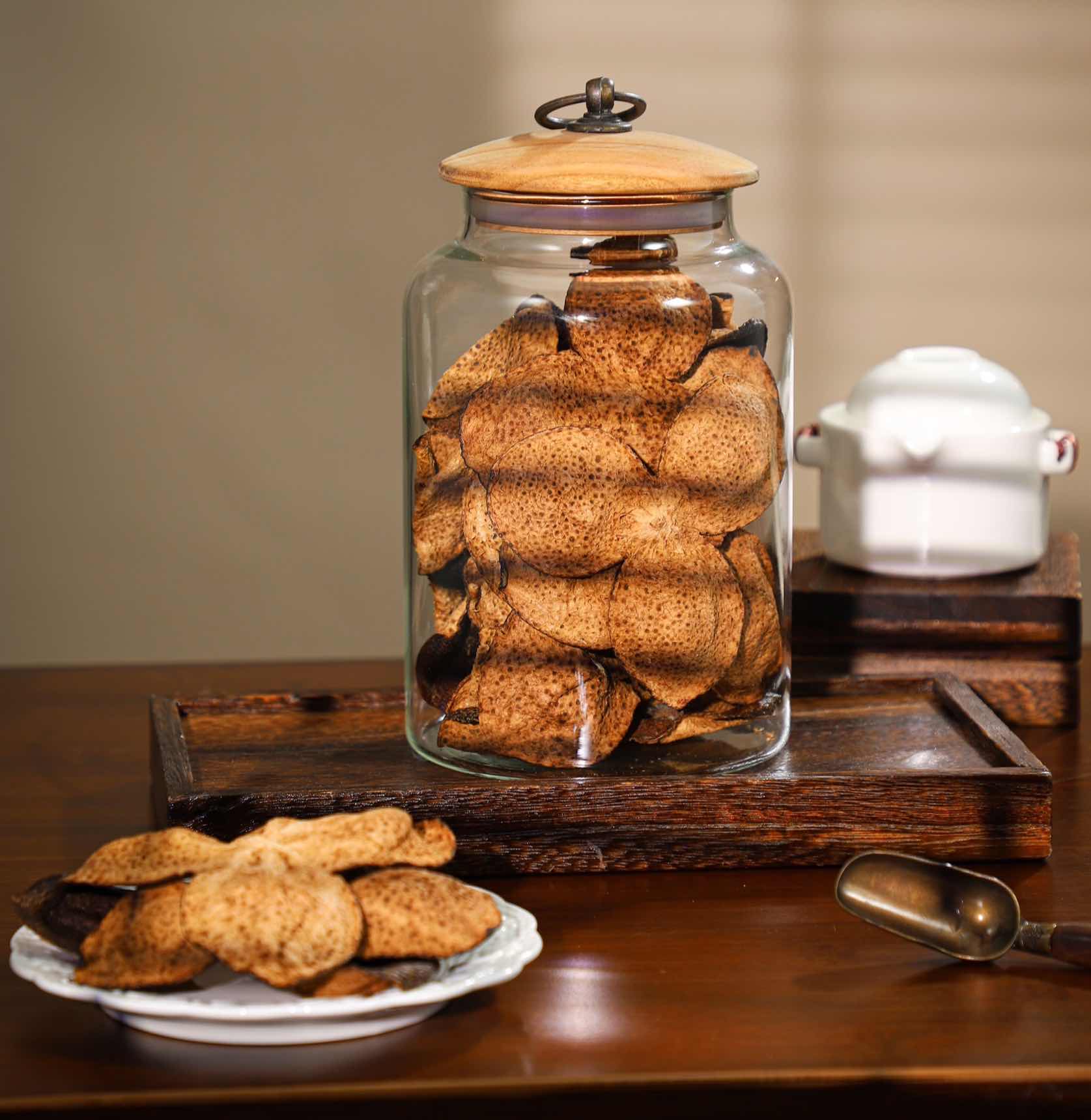 真相: 自然陈化的陈皮表面出现的“白霜”,多是柑油结晶(柑油晶),属正常现象,与霉菌菌丝完全不同。需通过气味和形态仔细辨别,不可一概而论。