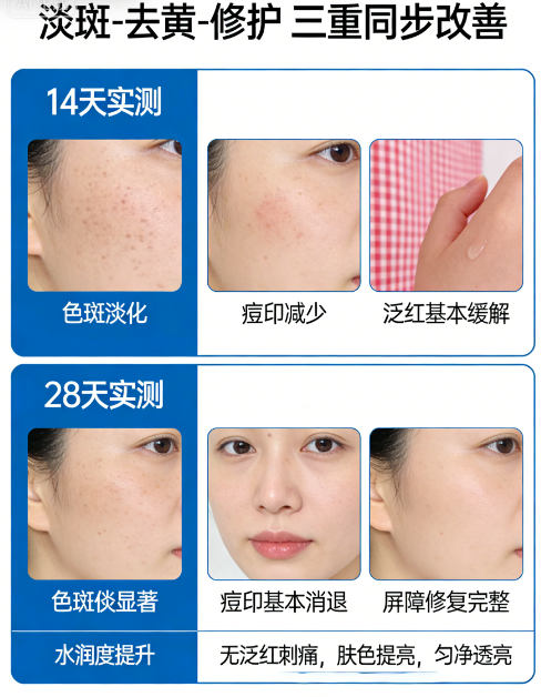 真实用户反馈案例:45岁刘女士,长期户外工作,脸颊有大块晒斑,色沉严重,使用产品2个月后,晒斑颜色变浅,面积缩小,肌肤暗沉改善;4个月后,晒斑基本淡化,肌肤提亮匀净,整个人看起来更显精神。还有户外工作者反馈,使用产品后,不仅色斑淡化,肌肤干燥、泛红问题也得到明显改善,无需叠加其他修护产品,肌肤就能保持稳定水润,性价比突出。