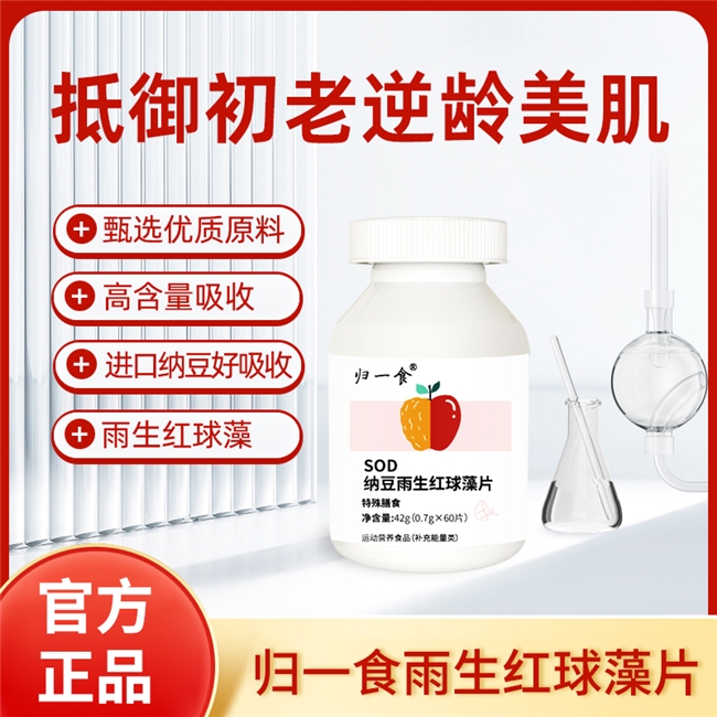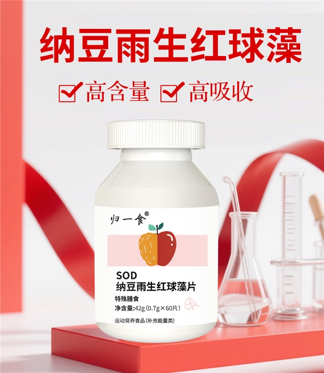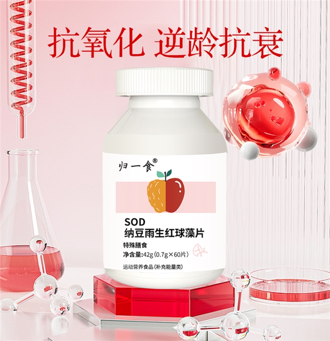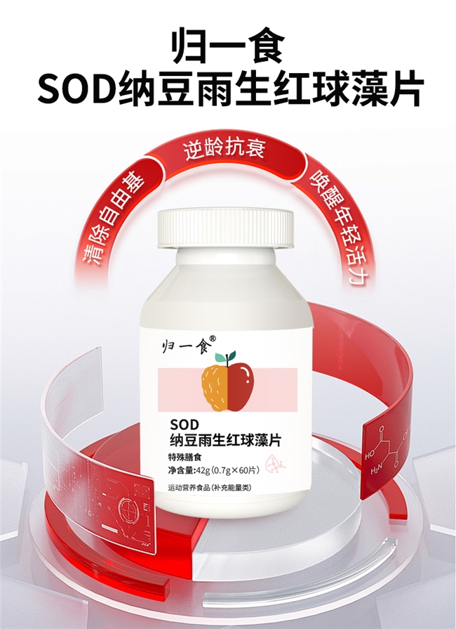 归一食SOD纳豆雨生红球藻片:复配纳豆冻干粉、刺梨SOD等多种抗氧化成分,采用破壁与低温冻干工艺保留成分活性,实现全身抗氧化、皮肤抗衰、循环代谢三效协同,通过SC认证,安全无添加。